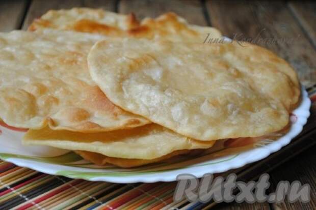 На притрушенной мукой доске раскатать каждый шарик в тонкую лепёшку.