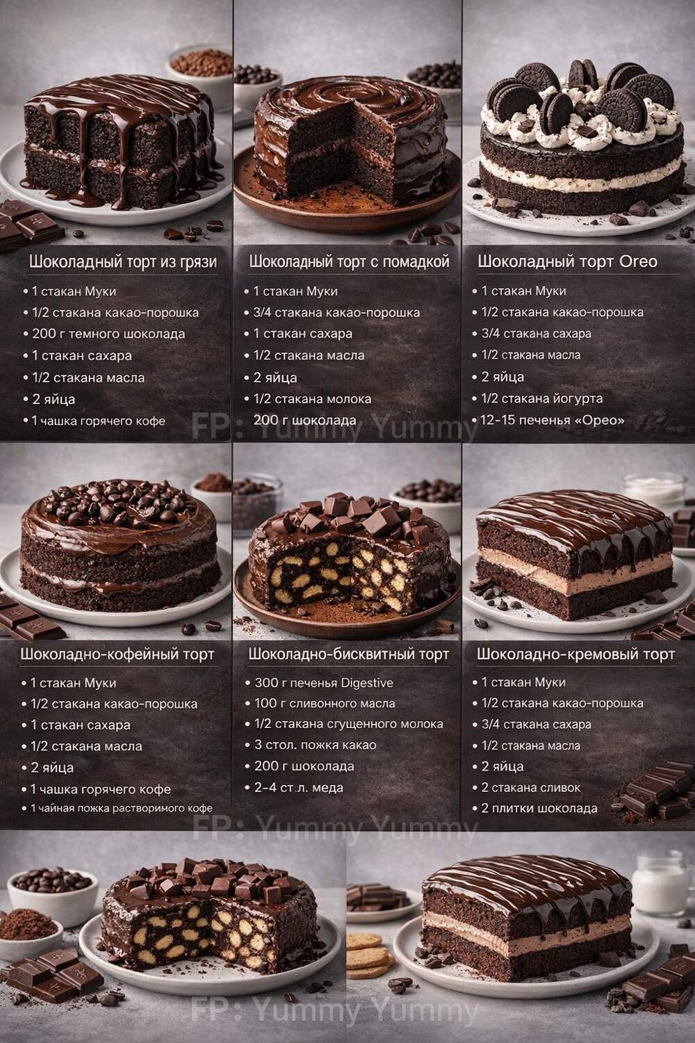 Откройте для себя разнообразие шоколадных тортов! От классического шоколадного торта из грязи до тортов с кофе, Oreo, печеньем и кремом. Каждый торт — это кусочек счастья! ✨ Рецепты: 1. Шоколадный торт из грязи: 1 стакан муки 1/2 стакана какао-порошка 200 г темного шоколада 1 стакан сахара 1/2... Далее