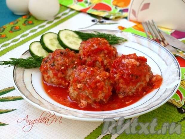 Тефтели, приготовленные в томатном соусе в духовке, подать к столу со свежими овощами.