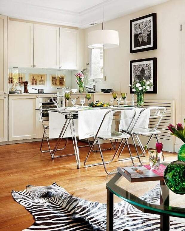 Симпатичное и удачное оформление комнаты плавно переходящей в невероятную, ко компактную столовую.