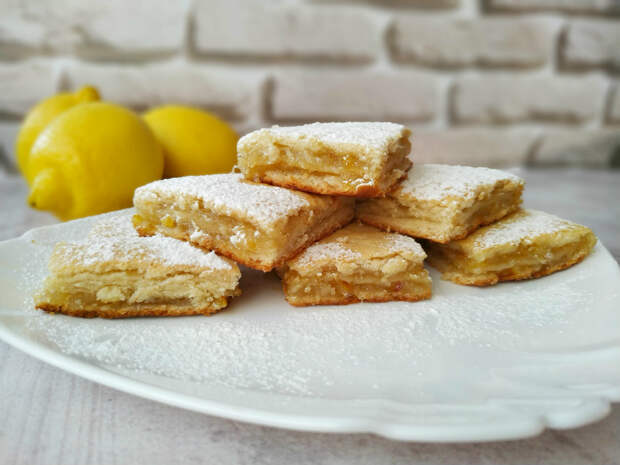 - После выпекания, обрезаем края, разрезаем лимонник на квадратики и посыпаем сахарной пудрой.