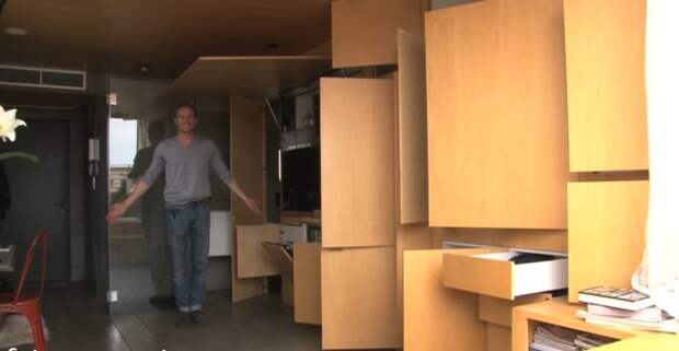 При входе в жилище гости видят только незначительные элементы декора и одну большую фанерную стенку. И тут происходит настоящее чудо: хозяин начинает нажимать на разные части стенки, которые являются дверцами всевозможных размеров. И перед взором гостей появляется кухня, холодильник, гардеробная и прочие ниши, в которых находятся необходимые в быту предметы.