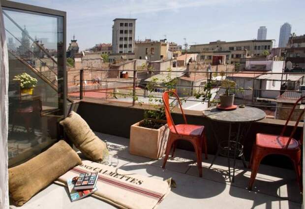 Кровать выдвигается из своеобразной деревянной лавки, одновременно служащей ступенью к выходу на балкон.