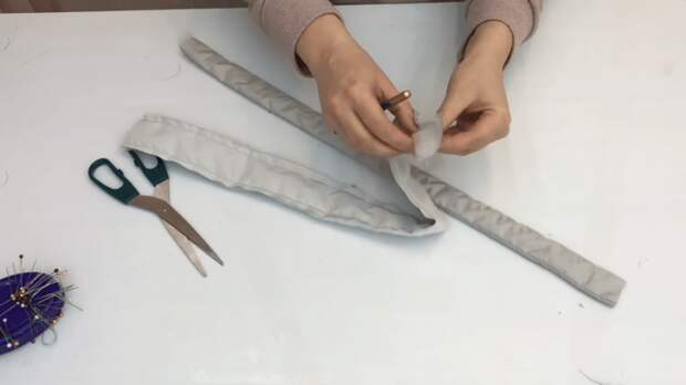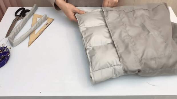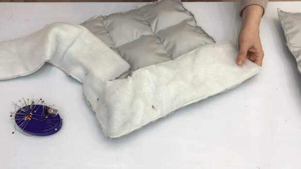 По мере прокладывания швов булавки становятся ненужными. Набивочный материал по мере прострачивания распределять внутри отсеков не нужно, все выровняется чуть позже, на готовой детали.
