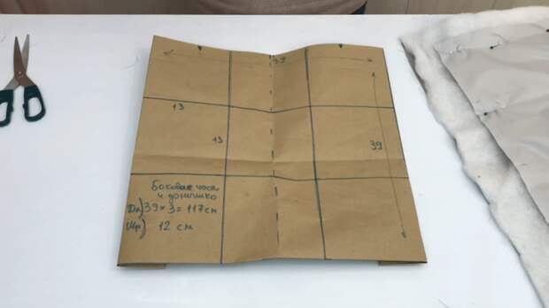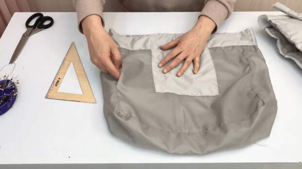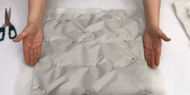 Каждая деталь состоит из 2 слоев: плащевой ткани и синтепона. Раскроив детали совмещаем синтепон с основным полотном. Условно делим основную заготовку на квадраты, обозначив их портновскими булавками.