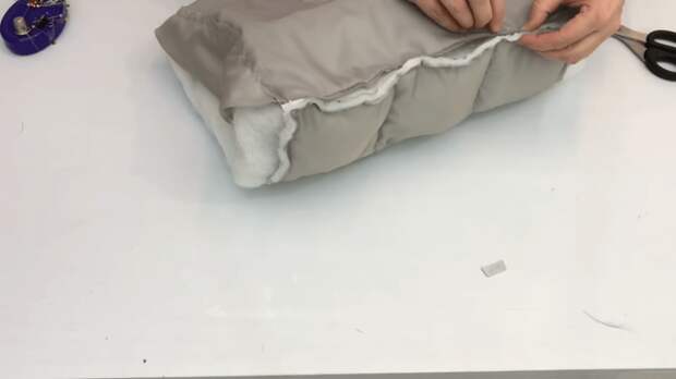 Начинаем с прошивки стеганых деталей. Прокладывать швы здесь нужно постепенно. Важно обеспечить доступ к каждому из отсеков. Отсеки набиваются поочередно, а затем застрачиваются по мере наполнения. При работе важно следить за тем, чтобы набивка не попадала в швы.