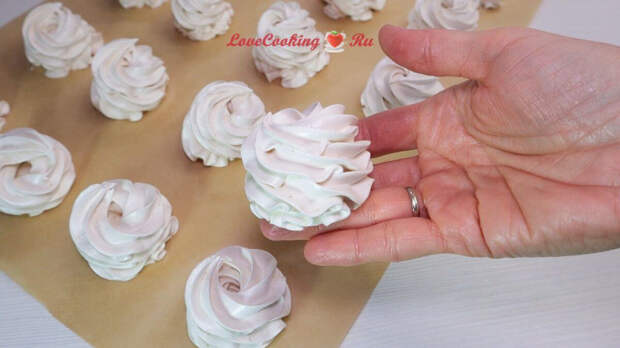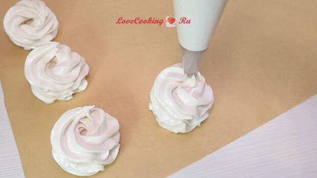 Масса очень быстро стабилизируется, работаем быстро. Кондитерский мешок с насадкой и пергаментную бумагу подготовьте заранее.