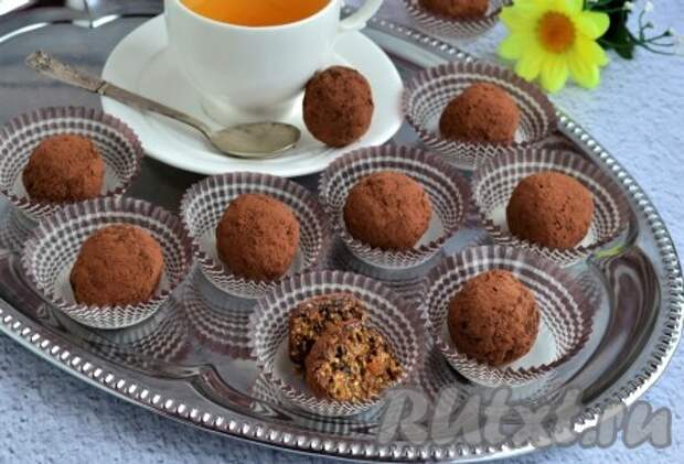 Обвалять конфеты из сухофруктов и овсяных хлопьев в какао-порошке.