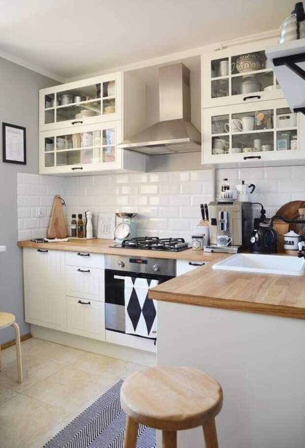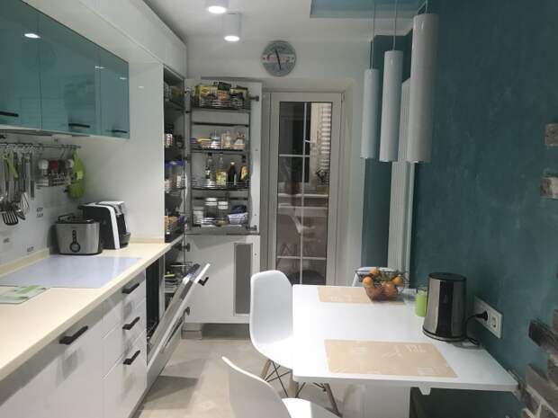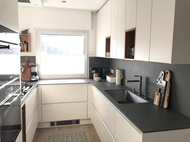 Незаметные вытяжка и раковина, подстроенные под фасад и столешницу, позволяют сделать образ более лаконичным, что отлично сказывается на атмосфере интерьера в маленькой комнате.
