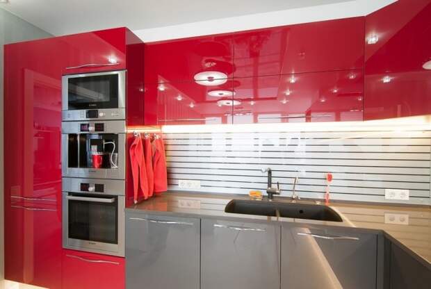 Яркие фасады кухни, особенно в глянце, сейчас соперничают друг с другом за звание самого модного оттенка. Арбузный или абрикосовый? Клубничный или оттенок киви? Горький шоколад или капучино? Серебро или золото?