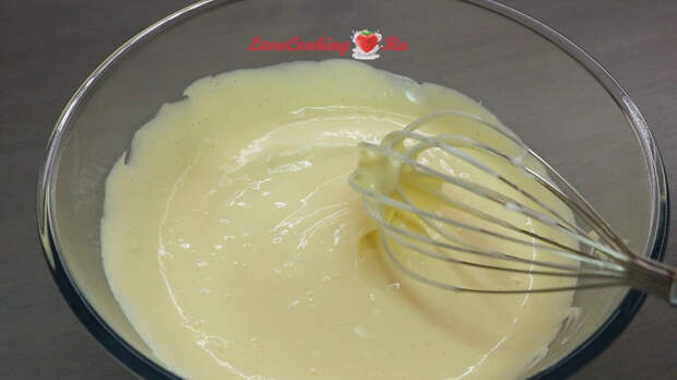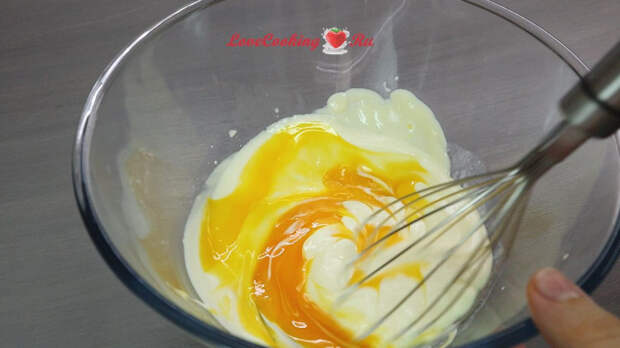Снимаем с водяной бани. Добавляем яичные желтки и хорошо перемешиваем венчиком.