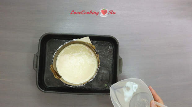 Ставим форму в другую форму для выпечки, но большего размера и глубокую. У меня это противень.