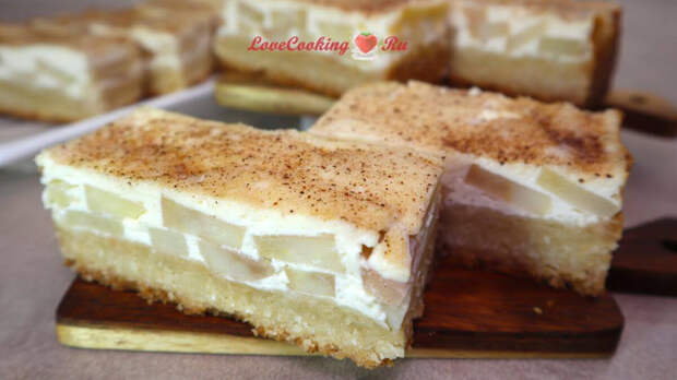 Этот грушевый пирог можно смело отнести к пирожным. Основа по вкусу и текстуре напоминает кокосовое печенье с аппетитной корочкой. Для начинки я выбрала груши, но с яблоками тоже будет очень вкусно. Если хотите, чтобы фрукты сохранили небольшую хрусткость, используйте более твёрдые сорта. Завершает пирог сметанная заливка, присыпанная сахаром с корицей.