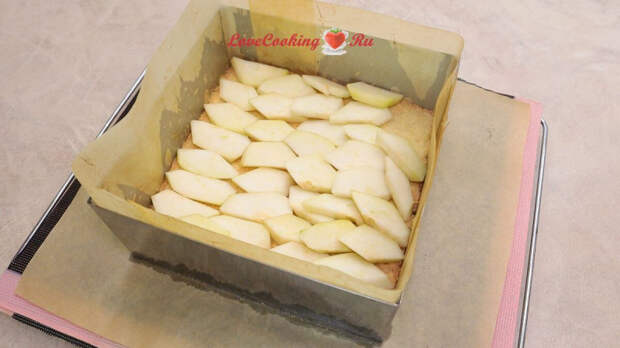 Толщину определяйте сами. Можно сделать тонкие слайсы и выложить в несколько рядов. Либо нарезать потолще, тогда фрукт будет немного хрустеть в готовом изделии.Выкладываем груши на кокосовый корж.